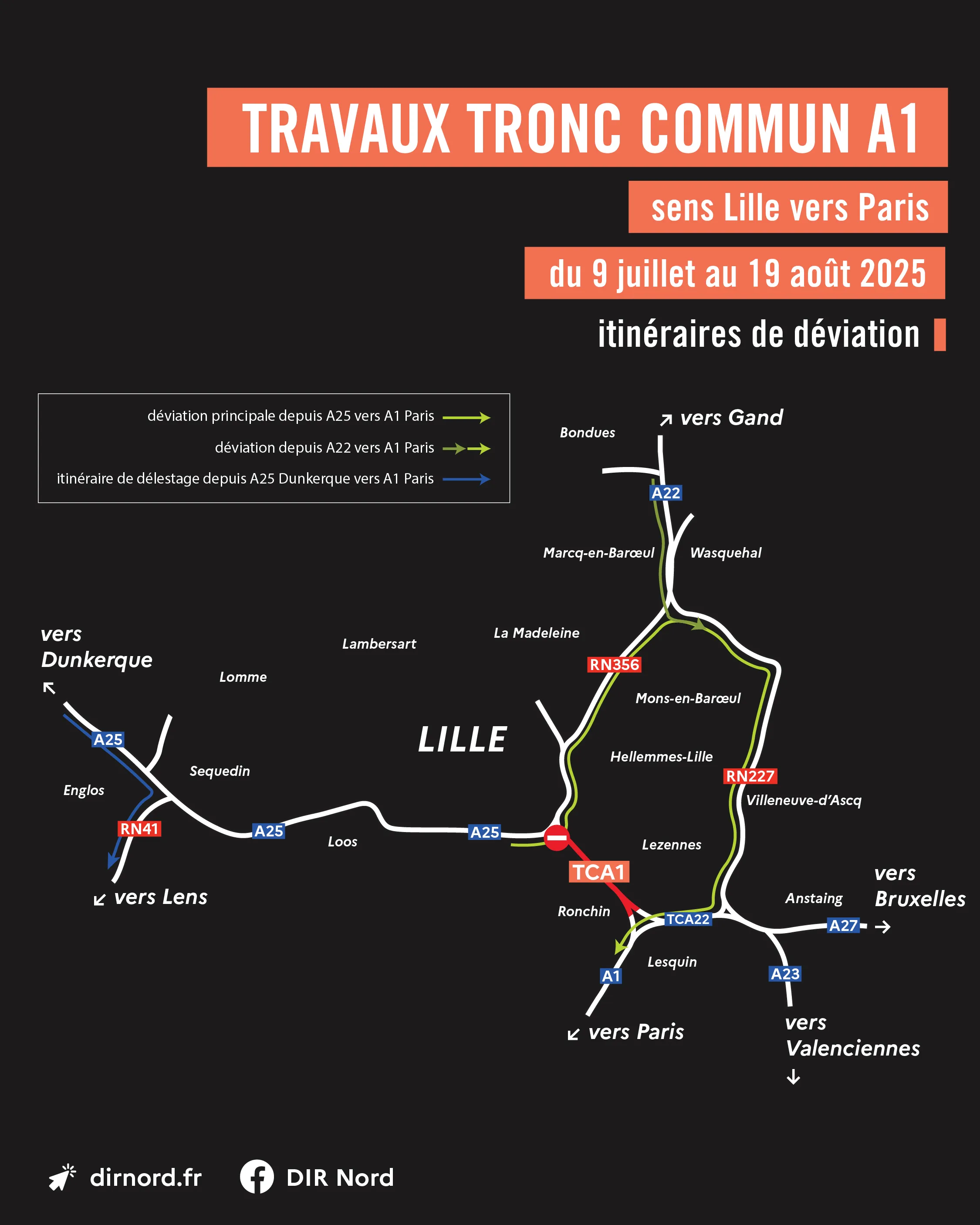 Pendant toute leur durée, le tronc commun avec l'A25 sera totalement fermé, de jour comme de nuit.