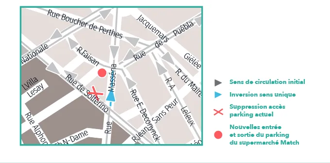 L'accès au parking du supermarché, côté rue Solférino, est aussi définitivement fermé. L'entrée et la sortie se font depuis la rue du Faisan.