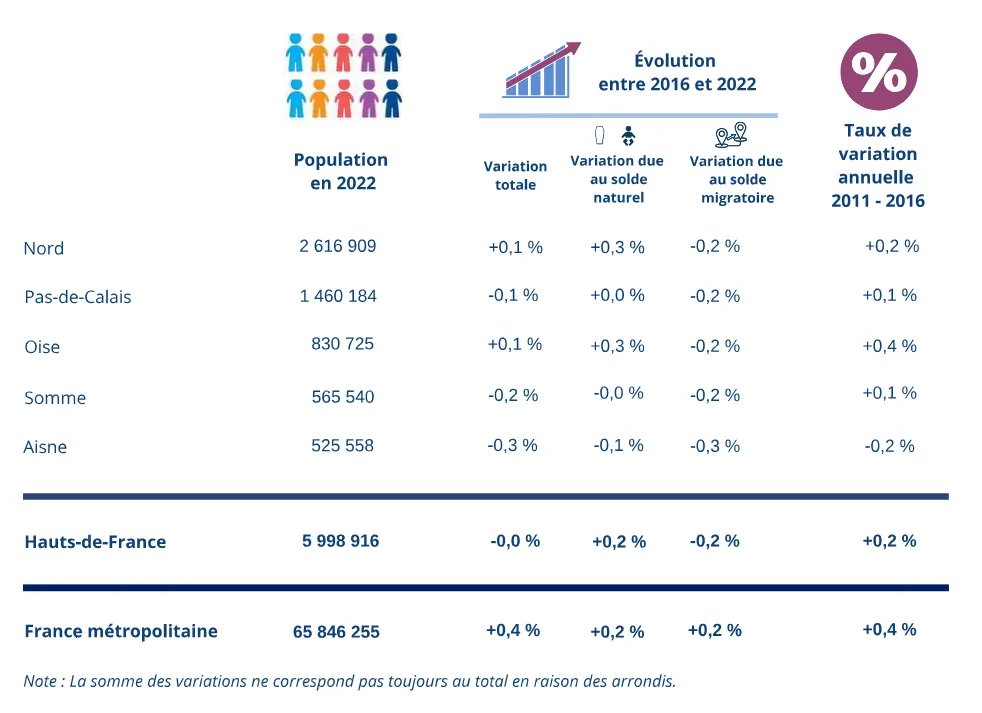 Le Nord ets toujours le plus peuplé de France métropolitaine, alors que le Pas-de-Calais, la Somme et l'Aisne observent un déclin de leur population.