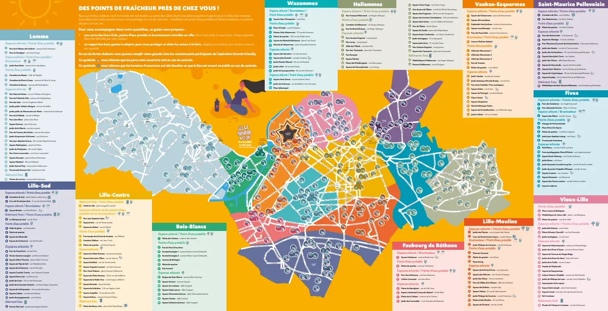 Plusieurs points d'eau potable en accès libre et des brumisateurs répartis dans tous les quartiers (Square Verhaeren au Faubourg de Béthune, Square des Mères à Fives, Square Philippe de Comines à Moulins, Square Bardou à Lille-Sud, à l'angle des avenues Mathias-Delobel et du 43e-RI à Vauban-Esquermes, Square Ghesquière à Wazemmes et au Parc Jean-Baptiste Lebas dans le centre).