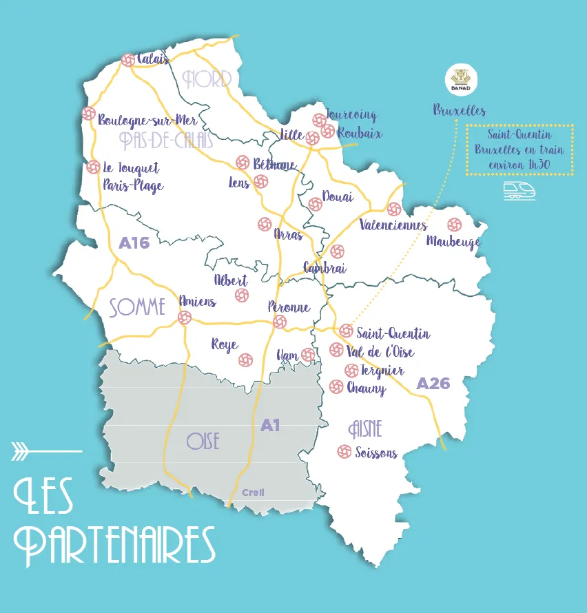 Les différents événements auront lieu à Albert, Amiens, Arras, Béthune-Bruay, dans l'Avesnois, à Boulogne-sur-Mer, Calais, dans le Cambrésis, le Douaisis, à Roye, Chauny, Saint-Quentin, Santerre, Valenciennes, Soissons, Lens-Liévin et Hénin-Carvin, au Touquet, à Lille, Roubaix et Tourcoing.