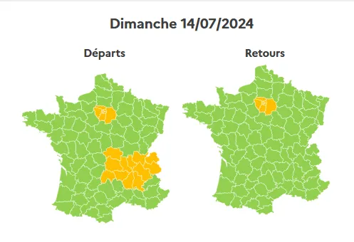 - 14 juillet : vert au niveau national et orange en Ile-de-France et Auvergne-Rhône-Alpes.