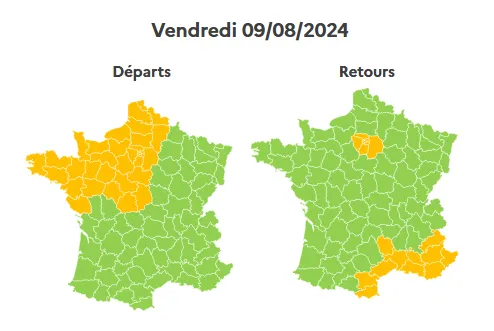 > Pour les départs : la journée est classée verte partout, sauf sur le quart nord-ouest de la France, en jaune.