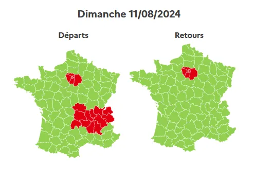 > Pour les départs : Paris et ses environs sont à éviter, de même que la région Auvergne-Rhône-Alpes, qui sont en rouge. Ailleurs, c'est vert.