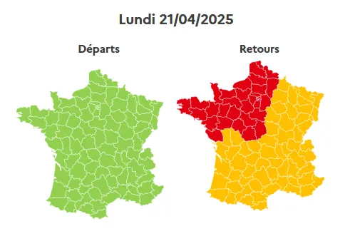 En revanche, retour des embouteillages le lundi de Pâques : c'est rouge dans le Nord, l'Ile-de-France et le Grand Ouest (le reste en orange).