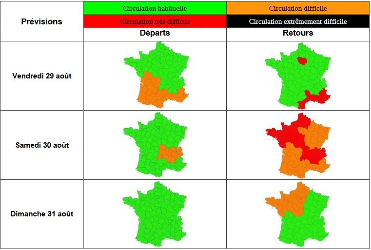 - Pour les retours : vert sur toute la France, sauf dans le Nord, l'Ile-de-France et le Grand-Ouest.