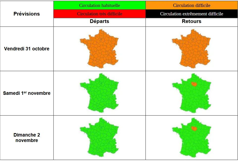 Ce vendredi 31 octobre, l'entièreté de l'Hexagone est classée orange par Bison Futé, que ce soit dans le sens des départs, comme des arrivées. La circulation sera donc difficile.