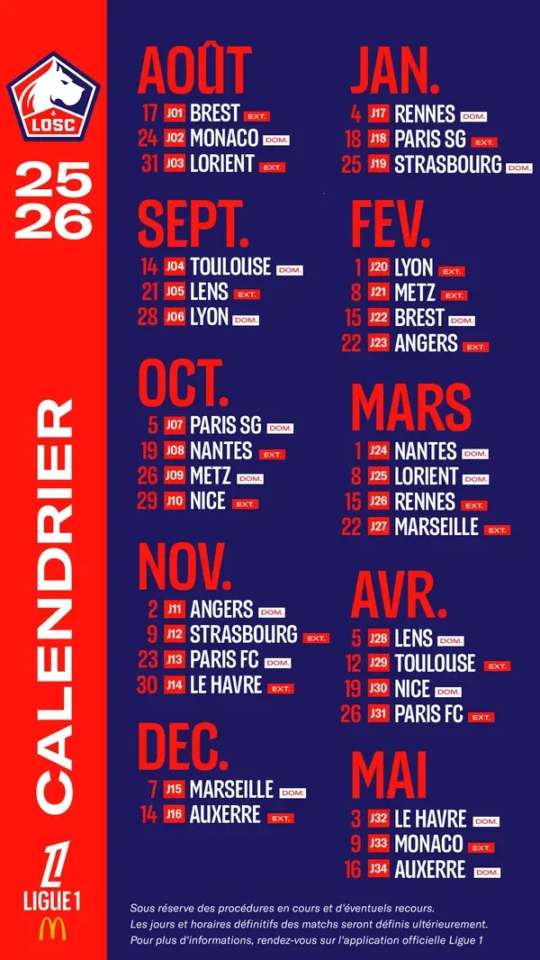 La 1ère journée se déroulera le 17 août prochain, tandis que la saison se terminera le 16 mai 2026.