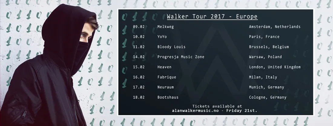 Alan Walker, jeune producteur norvégien, semble avoir réussi à séduire le monde de l’electro avec des hits comme "Faded" et "Sing Me To Sleep". Cette popularité grandissante conduira Alan Walker à se produire en première partie de Rihanna sur quelques dates de son Anti World Tour. Fort de ce succès, Alan Walker annonce son passage en France ! C’est en effet dans le cadre de sa tournée européenne, qui débutera à Amsterdam, que son tourneur Live Nation nous confirme le show d’Alan Walker au YoYo à Paris le 10 février 2017. Alan Walker continuera son périple sur le vieux continent avec des concerts en Belgique, Pologne, Royaume-Unis, Italie et en Allemagne.