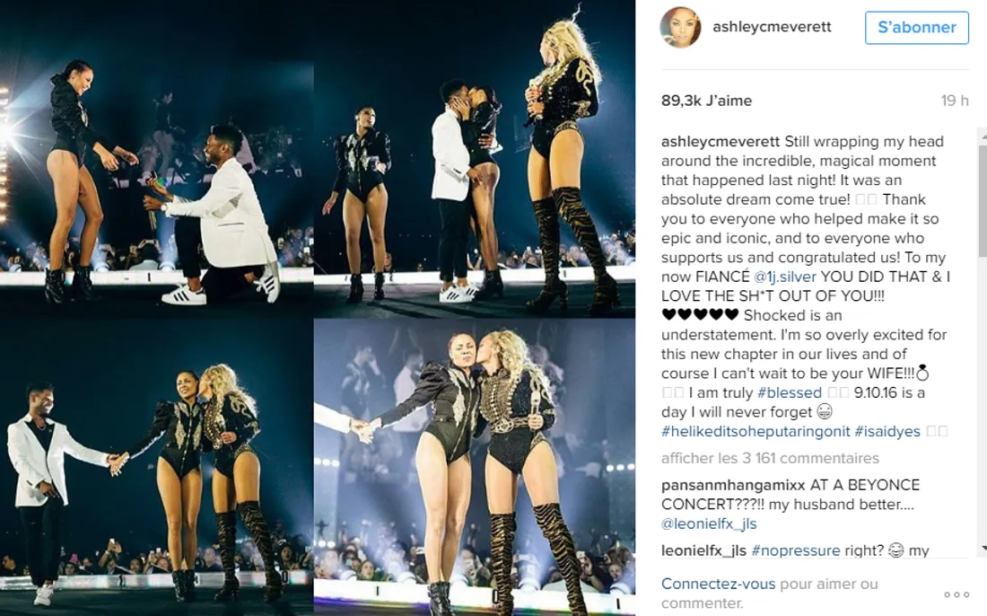 C'est un moment très émouvant que les fans de Beyoncé ont vécu ce week end ! Lors d’un concert de sa tournée mondiale à St Louis aux Etats-Unis, Beyoncé a commencé à interpréter "Single Ladies (Put a Ring on It)", tube qu'elle n'avait pas chanté depuis très longtemps sur scène. Accompagnée entre autre de sa danseuse Ashley Everett, Beyoncé a interrompu son show pour faire monter sur scène un invité spécial : John Silver, le petit ami d’Ashley, lui aussi chorégraphe sur la tournée !