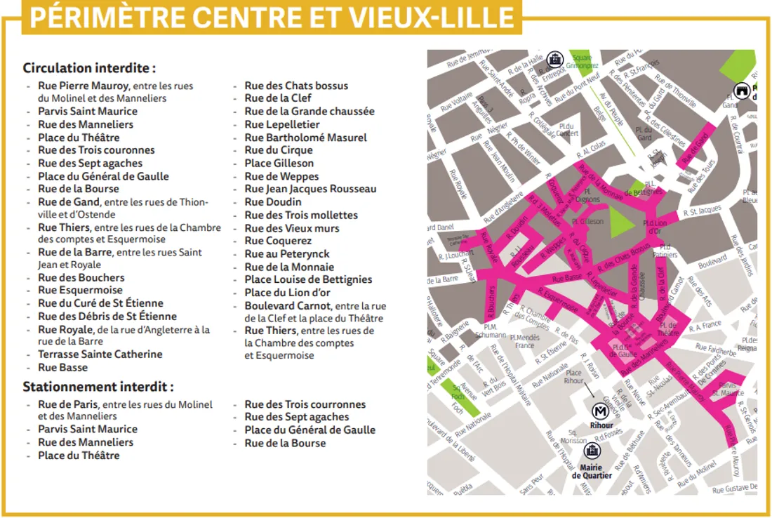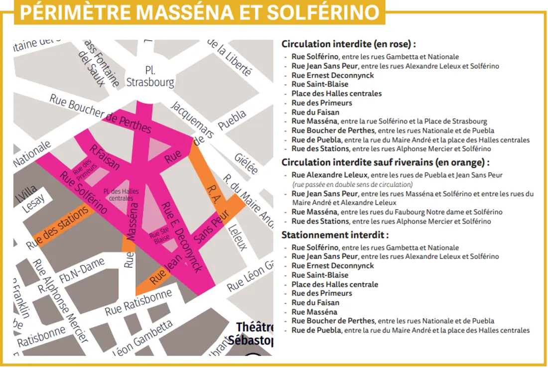 La circulation et le stationnement seront interdits dans les rues Solférino (entre rues Gambetta et Nationale), Jean Sans Peur, Masséna et la place des Halles.