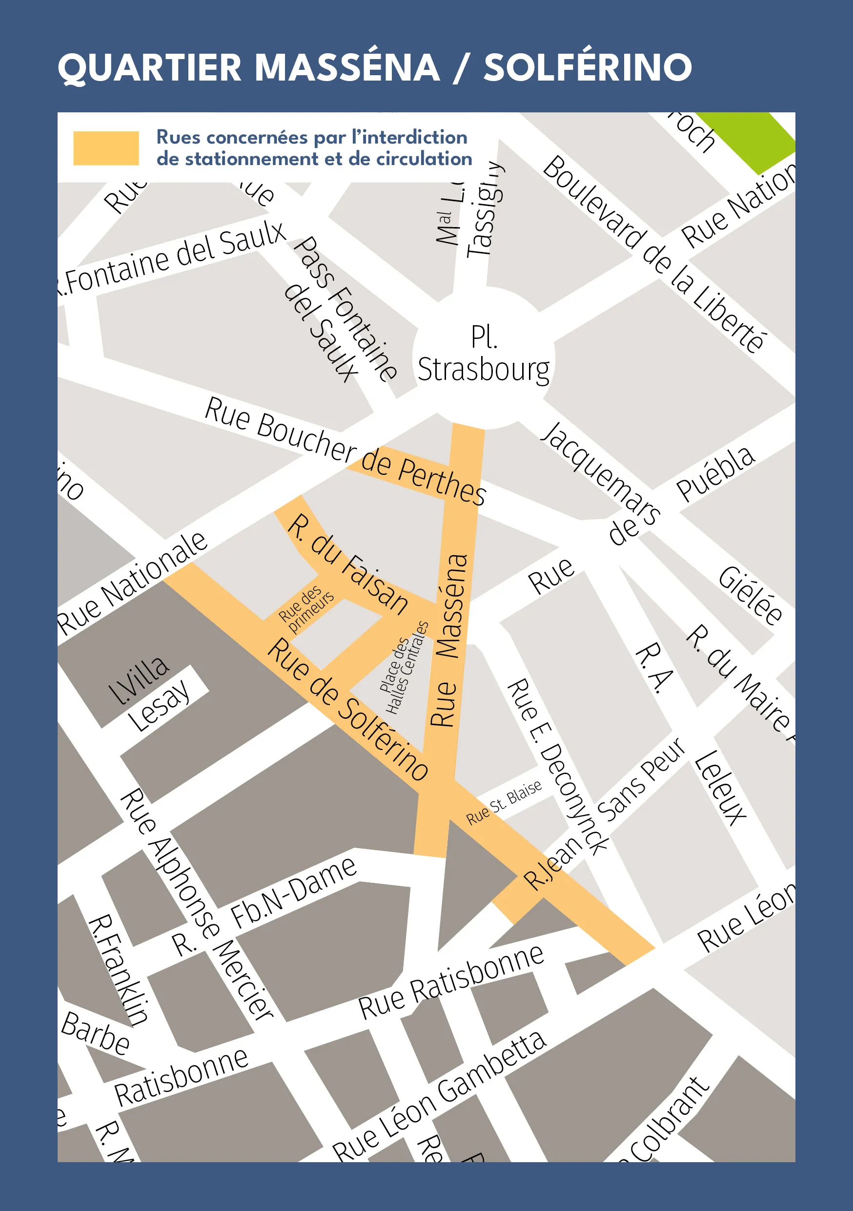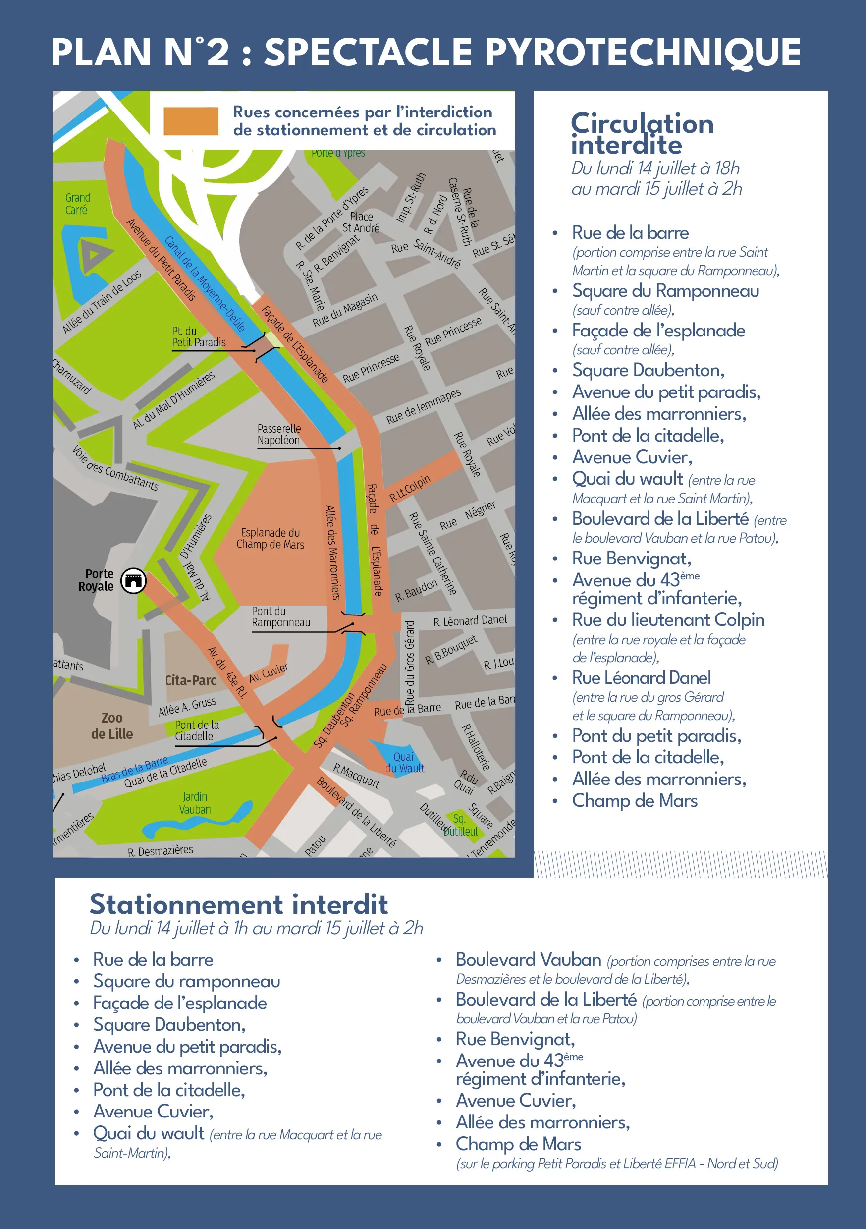 Du dimanche 13 juillet 20 h au lendemain 1 h, le Vieux-Lille et les rues Masséna-Solférino seront interdites à la circulation et au stationnement.