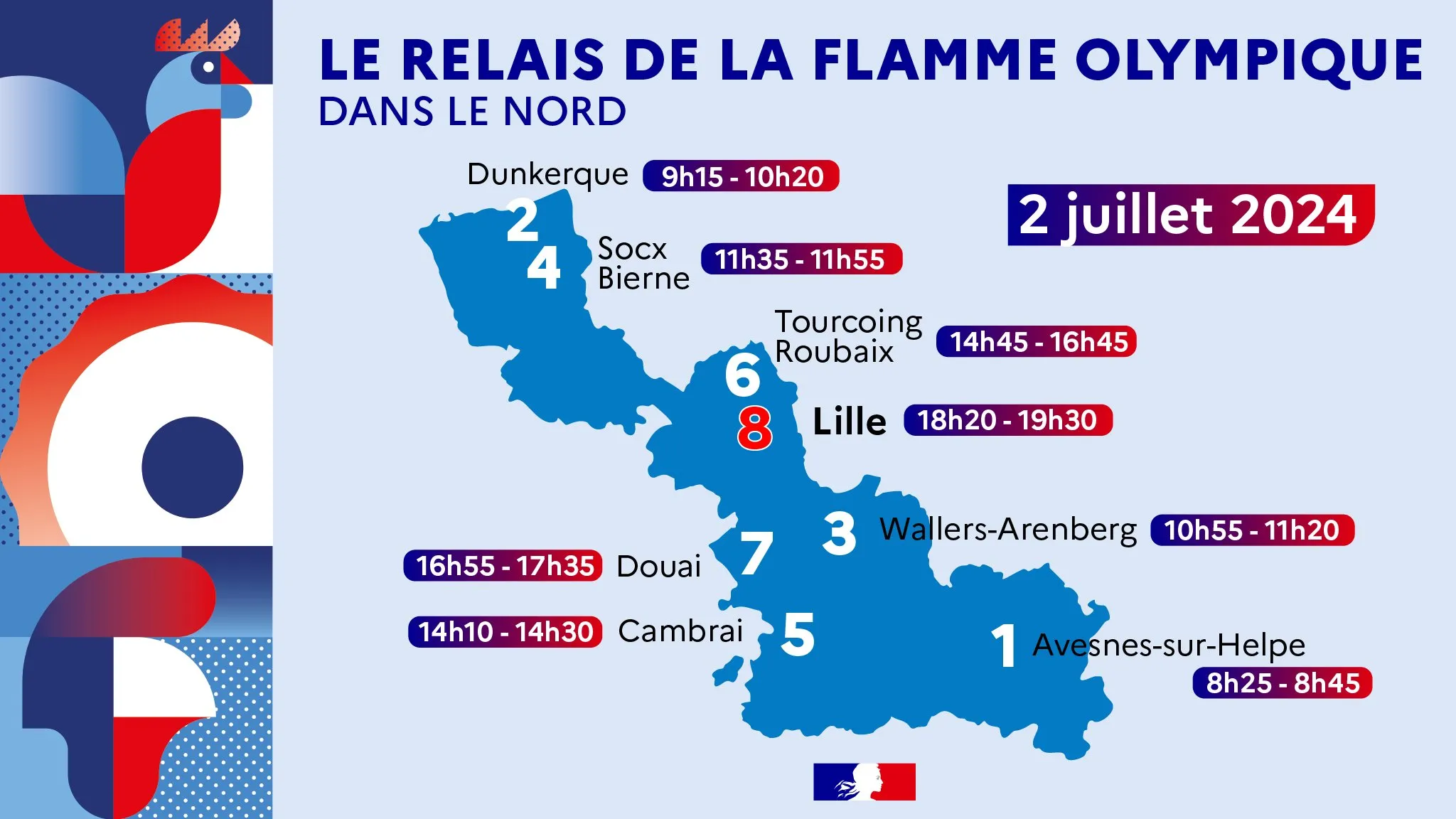 La flamme arrivera dans le Nord le mardi 2 juillet à 8h25 à Avesnes-sur-Helpe. Première étape nordiste, 1 500 enfants seront mobilisés pour l'accueillir. Elle atteindra ensuite Dunkerque à 9h17, sur la digue de Malo-les-Bains.