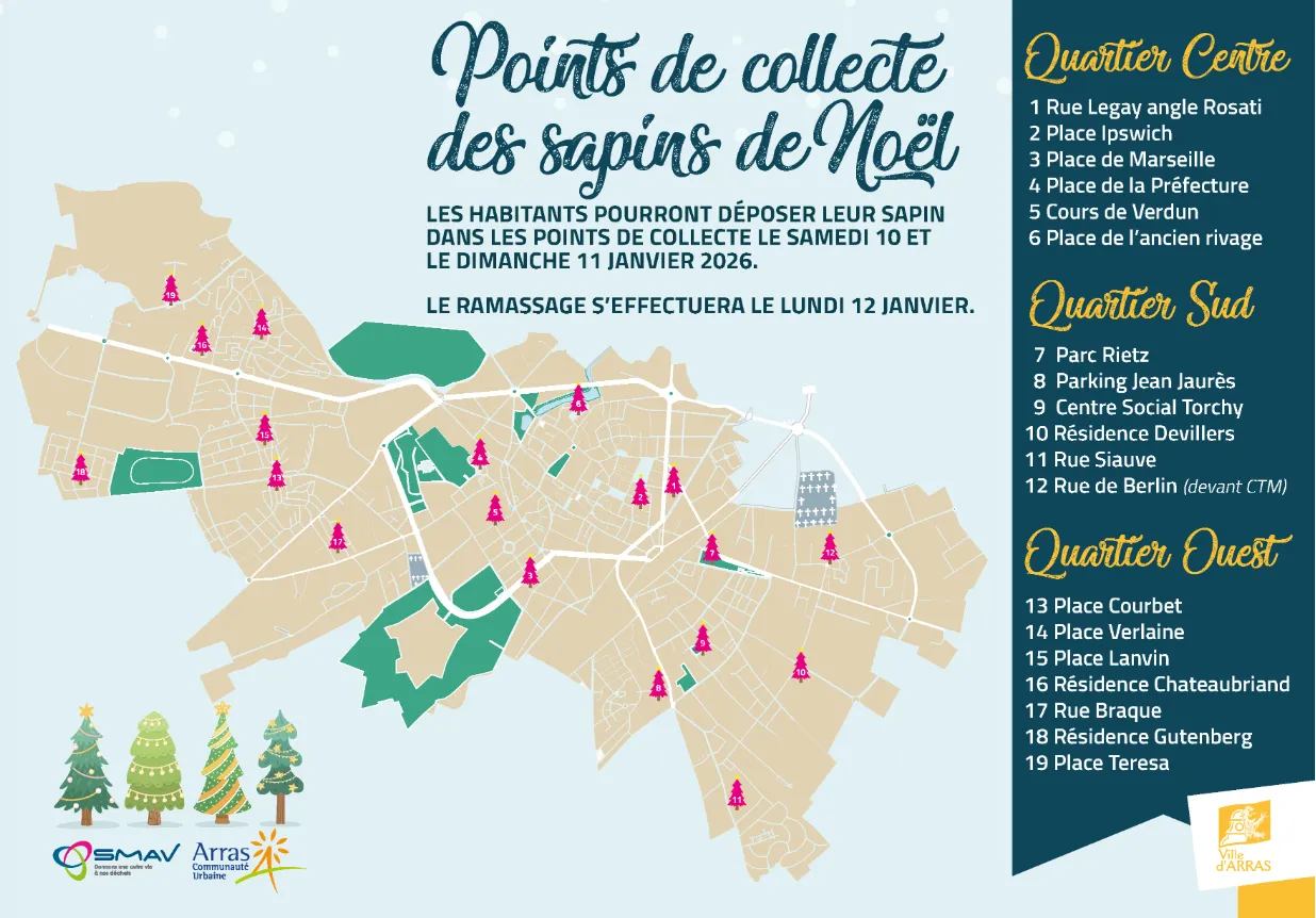Un service de collecte est mis en place à Arras les samedi 10 et dimanche 11 janvier prochain, pour un ramassage prévu le lundi 12. Vous pouvez les déposer dans 19 enclos différents un peu partout dans la ville.