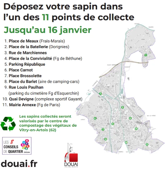 À Douai, vous avez jusqu'au 16 janvier pour déposer votre sapin naturel, sans sac, ni décoration ou neige artificielle dans l'un des 11 points de collecte. Ils seront ensuite valorisés par le centre de compostage des végétaux de Vitry-en-Artois.