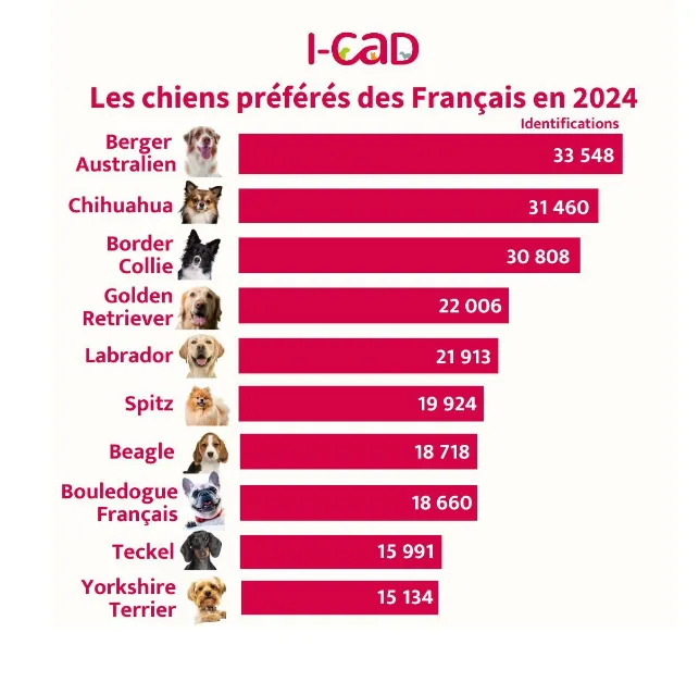 Pour les chiens : le Berger Australien (avec 33 548 nouvelles identifications), le Chihuahua (31 460) et le Border Collie (30 818).