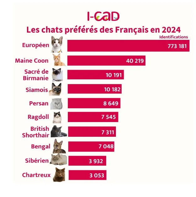 Pour les chats : le Chat européen (773 180 nouvelles identifications), le Maine Coon (40 219) et le Sacré de Birmanie (10 182).