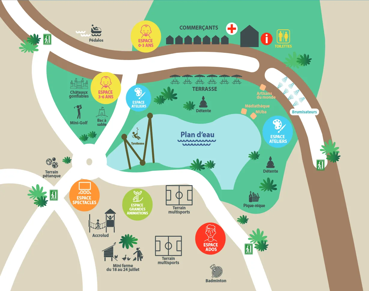 D'autres espaces thématiques sont installés : un dédié aux plus petits avec bac à sable et structures gonflables (0 à 6 ans), un autre avec des animaux de la ferme, un parcours accrobranche (pont de singe et tyrolienne), bassin mini-pédalos...