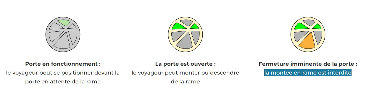 - Deux lumières vertes + lumière orange en bas = fermeture imminente des portes, plus possible de monter à bord.