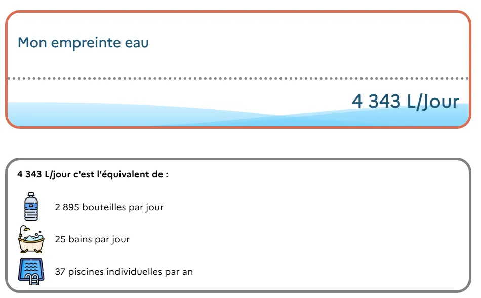 La moyenne française est de 6 000 L/jour, à voir la vôtre sur le site Mon Empreinte Eau.