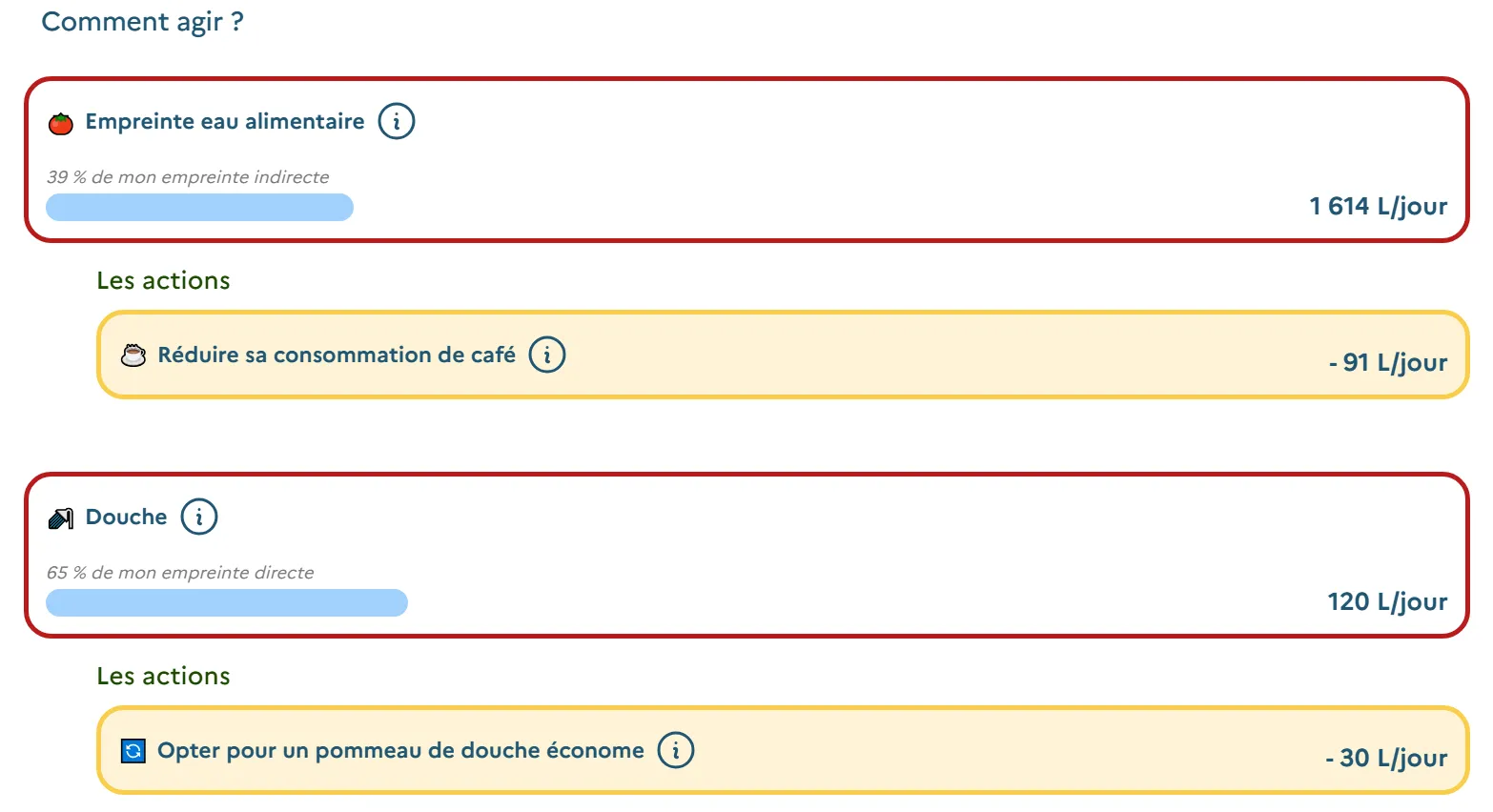 Par exemple, réduire sa consommation de café, acheter un pommeau de douche économe ou installer un récupérateur d'eau.