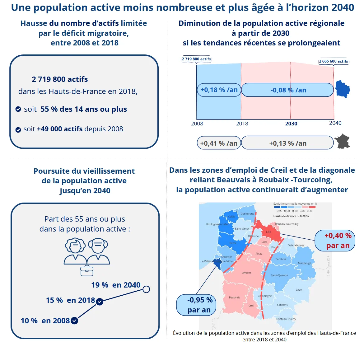 Si les tendances ne changent pas dans les années à venir, l'INSEE estime que la population active des Hauts-de-France diminuerait, à partir de 2030, pour atteindre 2 665 600 personnes en 2040.